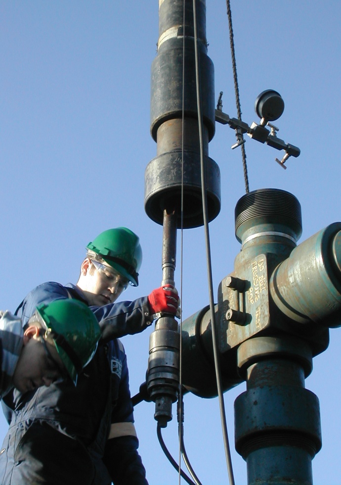 When a well is spud, a large-diameter drill bit is used to drill to a predetermined depth. This is for the purpose of drilling the surface hole. The surface hole is lined with steel casing. The casing protects aquifers which may contain freshwater, provides a mounting place for the blowout preventer, and serves as the support for the production casing that will be placed in the well bore if the drilling program is successful. The surface hole may be several hundred or several thousand feet deep. When the predetermined depth is reached, the drill string will be removed from the well bore. Steel casing of the proper diameter is inserted. Sufficient cement is pumped down the surface casing to fill the space between the outside of the casing and the well bore all the way to the surface. This is to insure the protection of freshwater aquifers and the security of the surface casing. The casing and the cement are tested under high pressure for several hours before drilling operations may be resumed. A piece of equipment known as a blowout preventer is attached at the top of the surface casing. This device is required to control the well in the event that abnormal pressures are encountered in the bore hole that cannot be controlled with drilling fluid. If high-pressure gas or liquid blows the drilling fluid out of the well bore, the blowout preventer can be closed to confine the gas and fluids to the well bore.