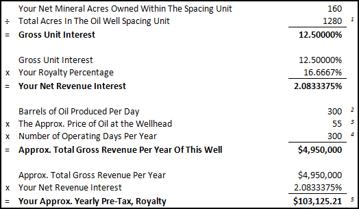 Take your information and follow the example below. We have used 160 net mineral acres on a 1,280 acre spacing unit with a royalty rate of 1/6 (16.667%) for this example. Of course, this is merely for demonstration purposes. There are many additional factors that may affect your actual royalties.